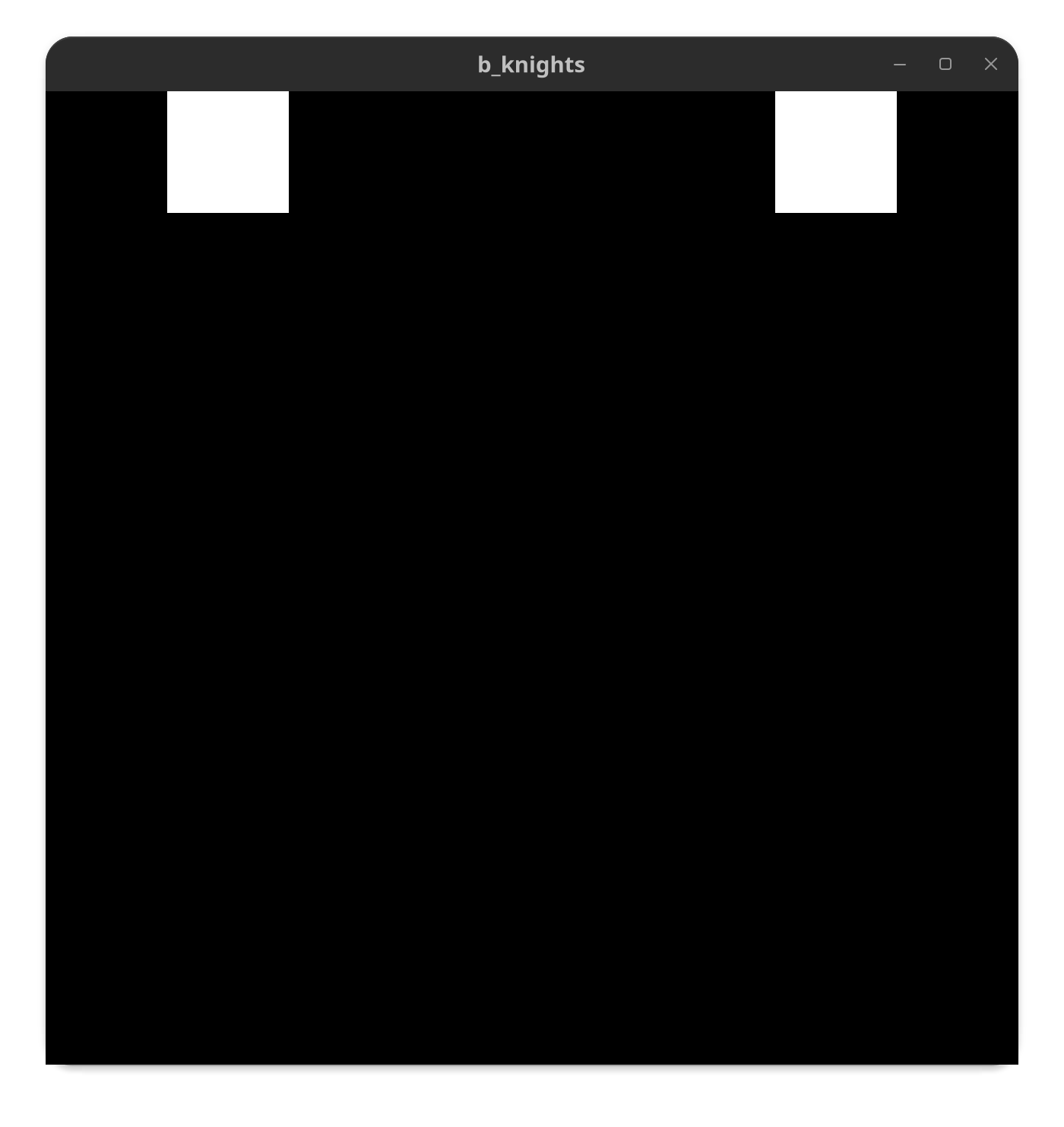Looping through the squares vector and appending the appropriate color and position we can draw 64 small squares depending on the size of the window the user has chosen (must be square). We know the color of a square based on the sum of the 2D coordinates, (0,1) for example is an odd sum and would be black.